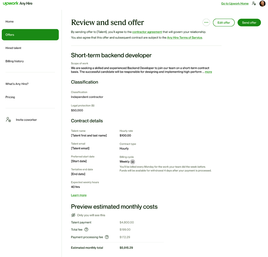 - Your active BYO contract will be converted to a draft offer for Any Hire. Choose Review & send offer to review every draft before sending it to your talent to accept.