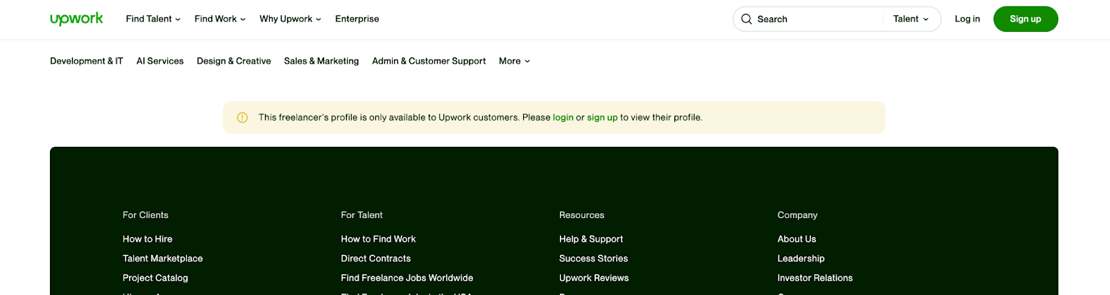 - Only Upwork Users — Only logged-in Upwork members can find your profile and it’s hidden from search engines.