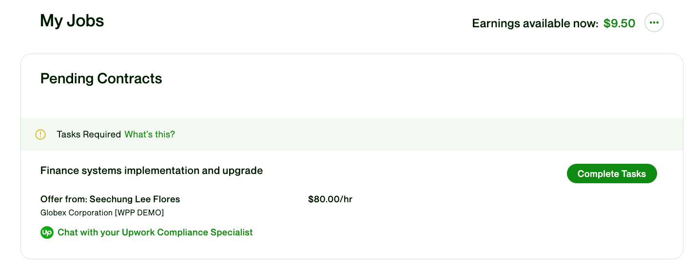 Please note that you cannot begin work until all required tasks are completed. Any work done before the contract has started cannot be billed through Upwork retroactively, so it's important that work does not start until contracting is 100% complete.