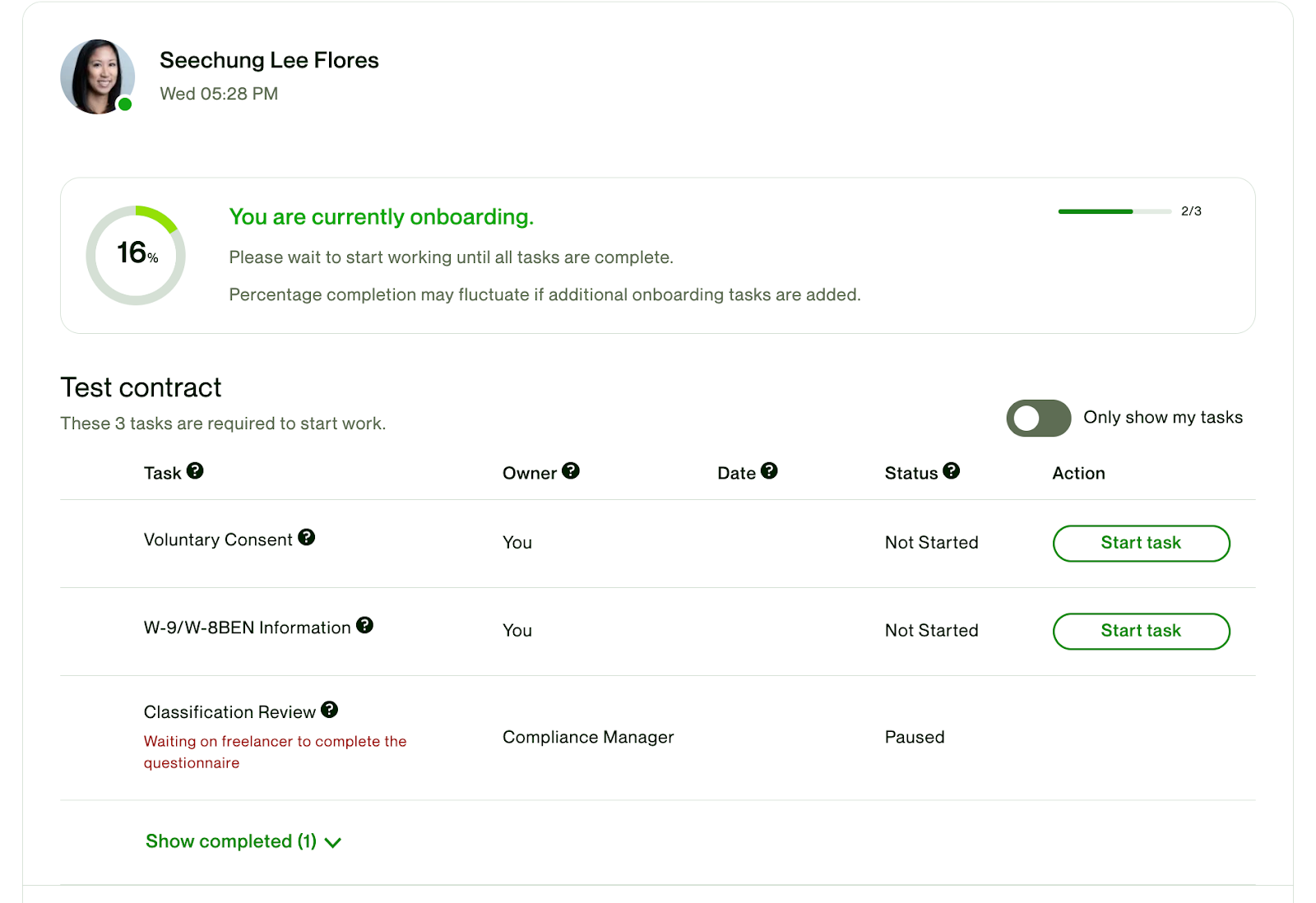 Some information you provide during onboarding is needed to confirm whether you qualify as an independent contractor or employee for the contract, which may include information about your business. Individual companies may require other tasks, such as a confidentiality agreement, and these tasks may vary between contracts and companies.